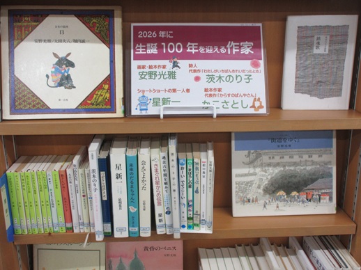 一般書コーナーでは2026年に生誕100年を迎える作家 画家「安野光雅」さん 詩人「茨木のり子」さん ショートショートの第一人者「星新一」さん 絵本作家「かこさとし」さん の4名を特集しています! 普段は書庫にある貴重な本も一緒に展示中です。 この機会に是非お手に取ってみて下さい♪ |